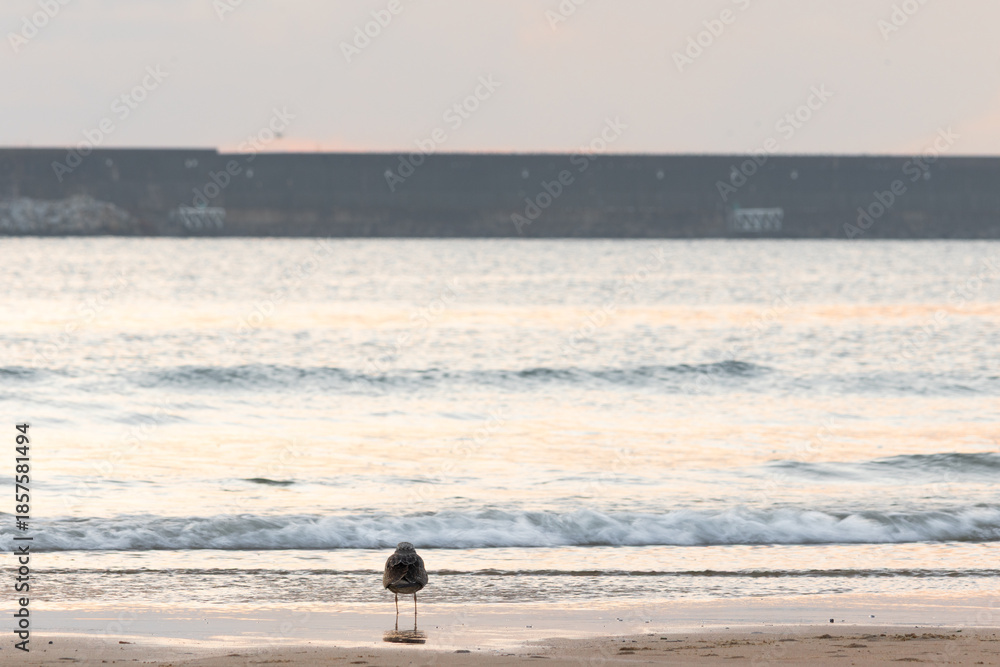 Fototapeta A lone seagull stands on a sandy beach facing gentle waves, with a calm sea and soft morning light creating a peaceful coastal atmosphere