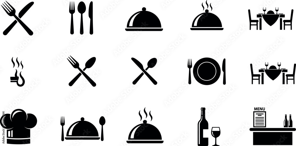 Fototapeta Set of restaurant and fine dining icons featuring cutlery, cloche, chef hat, wine bottle, and dinner table for gastronomy hospitality