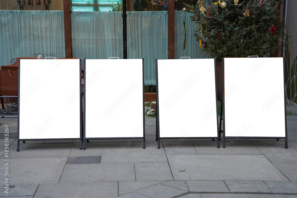 Fototapeta Four blank white outdoor advertising stand or sandwich boards mock up template p