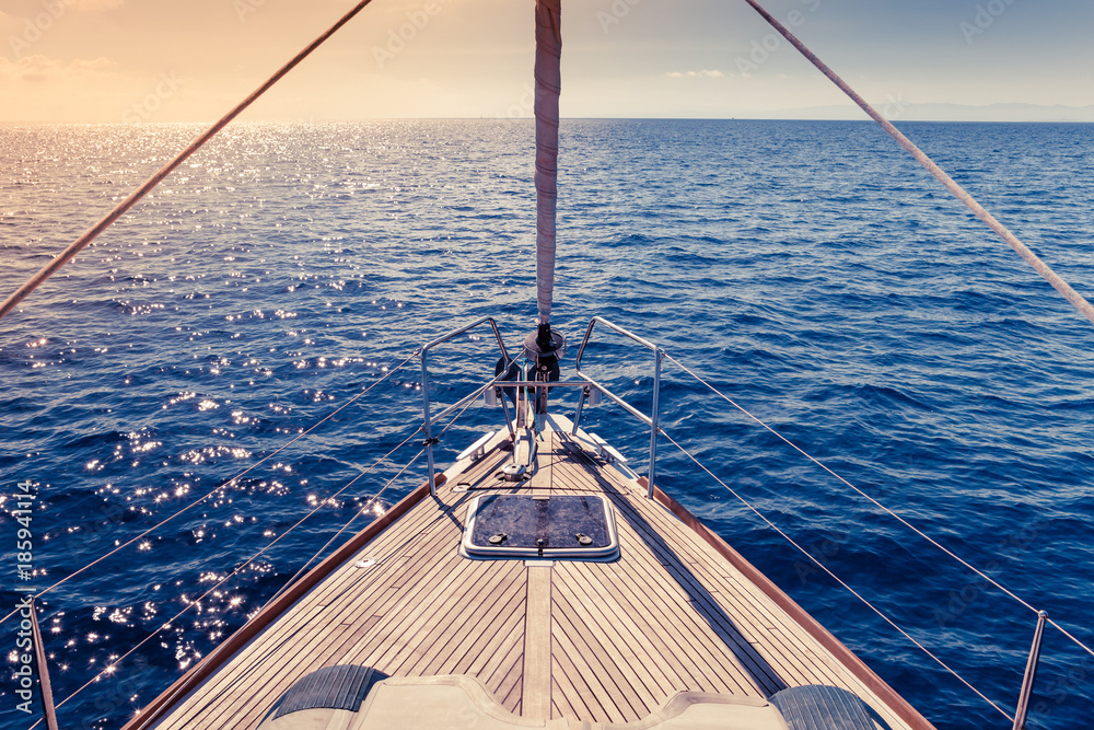 Fototapeta Ship's Bow, sailing yacht deck with open sea and warm sunlight
