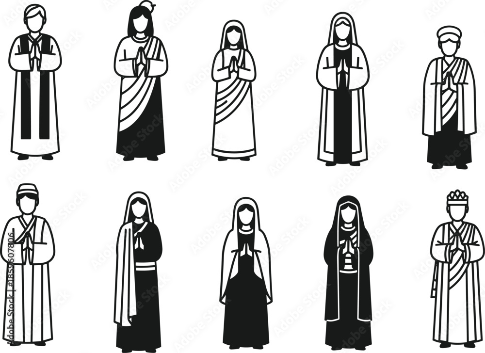 Fototapeta Religious figures silhouette, prayerful poses, diverse spiritual attire, cultura
