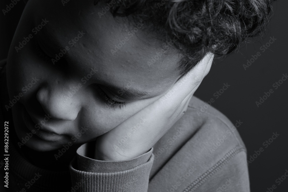 Fototapeta deaf boy and suffering from deafness and hearing loss on black grey background w