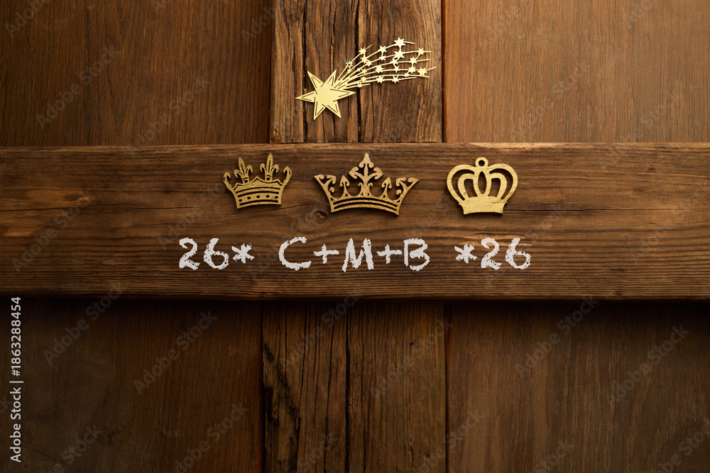 Fototapeta Epiphany door blessing with chalk and golden crowns