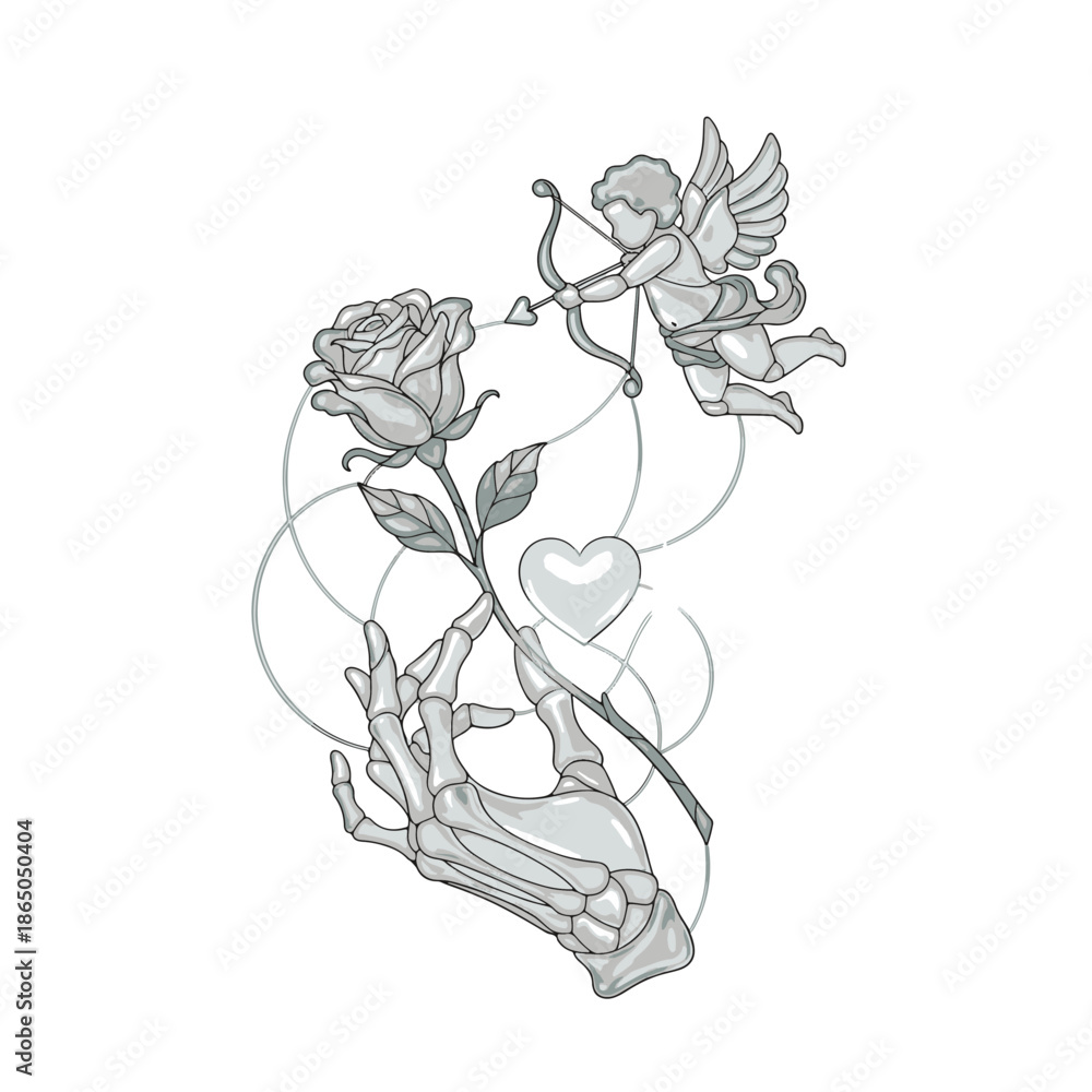 Fototapeta An ethereal 'Stained Glass' style illustration portraying Cupid aiming at a gleaming heart held by a skeleton hand entwined with a rose, symbolizing profound love and timeless destiny
