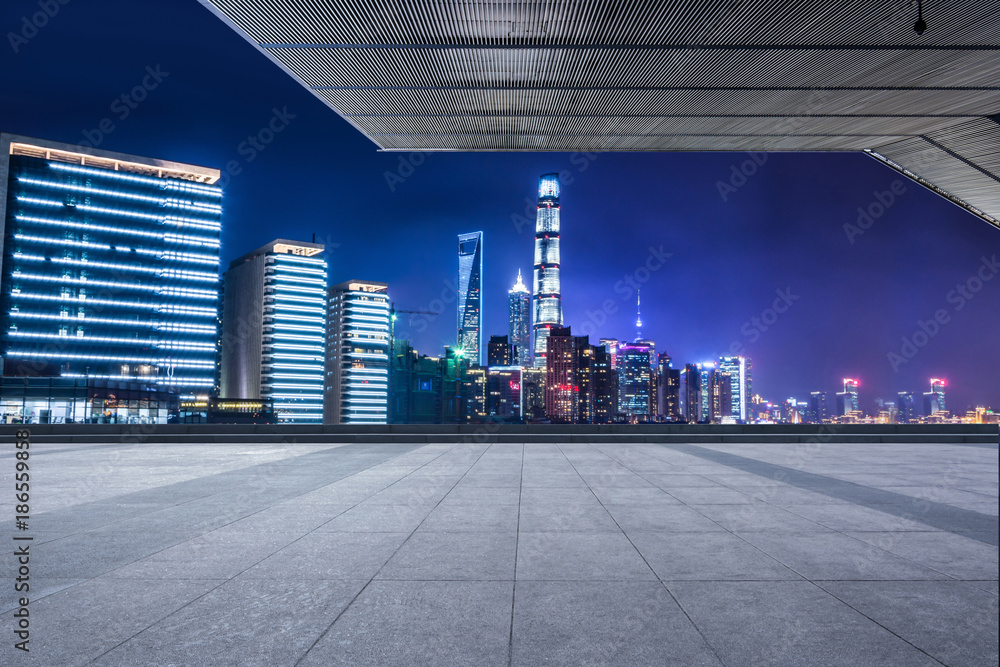 Fototapeta Empty floor with modern skyline and buildings at night in Shanghai