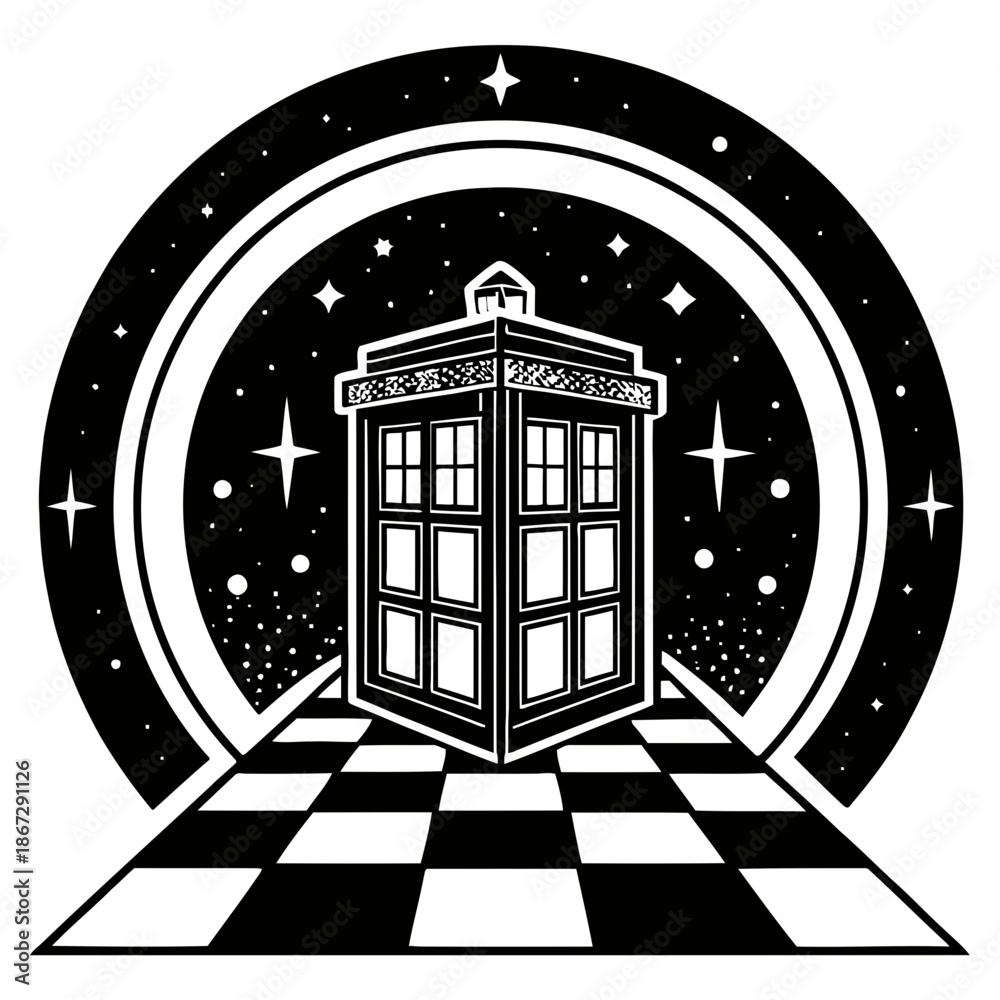Fototapeta A black and white vector illustration of the TARDIS in space