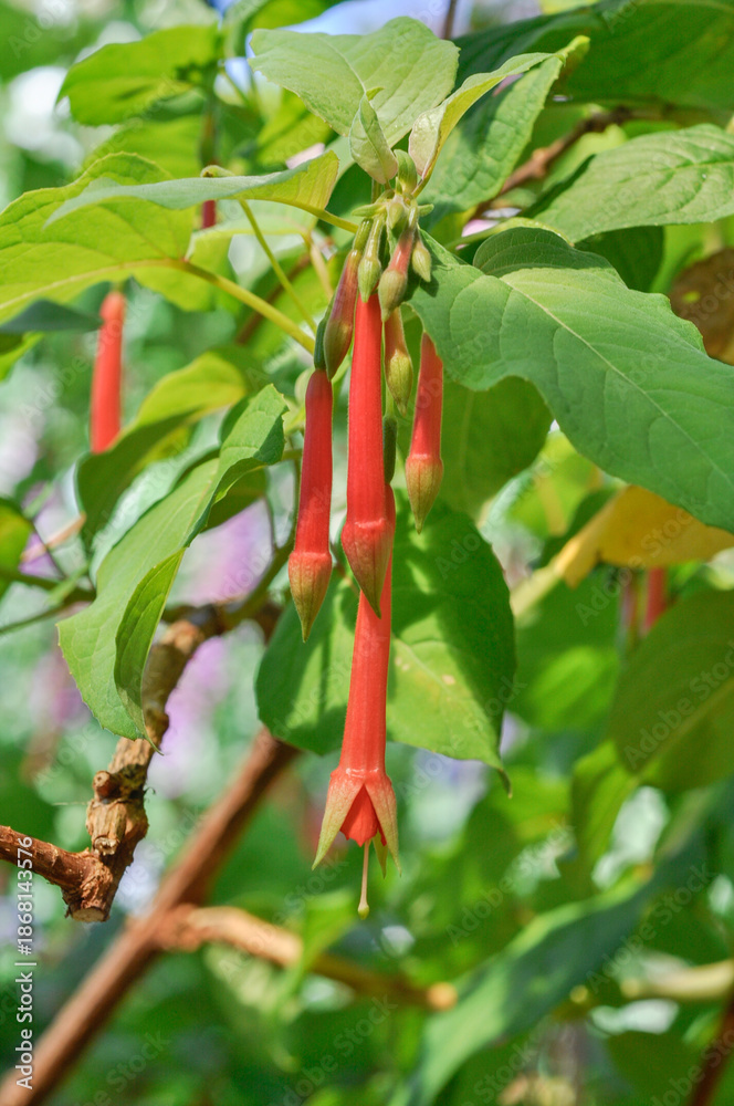 Fototapeta Hanging red fuchsia flowers with long tubular blooms and fine stamens, growing in dense clusters among layered green leaves, natural outdoor scene with rich plant structure and depth