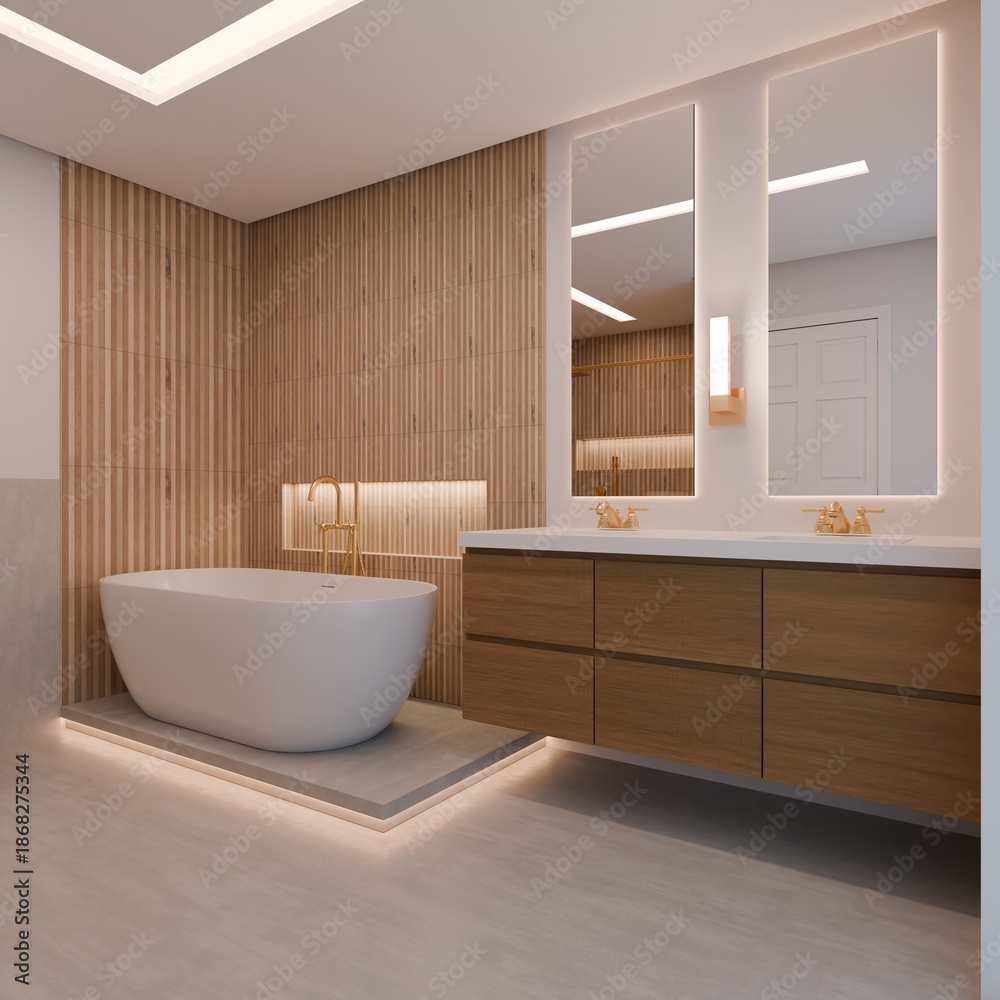 Fototapeta A modern bathroom design features a white bathtub on a platform, wooden slat walls, and a floating vanity with double mirrors and LED lighting, created using Blender software