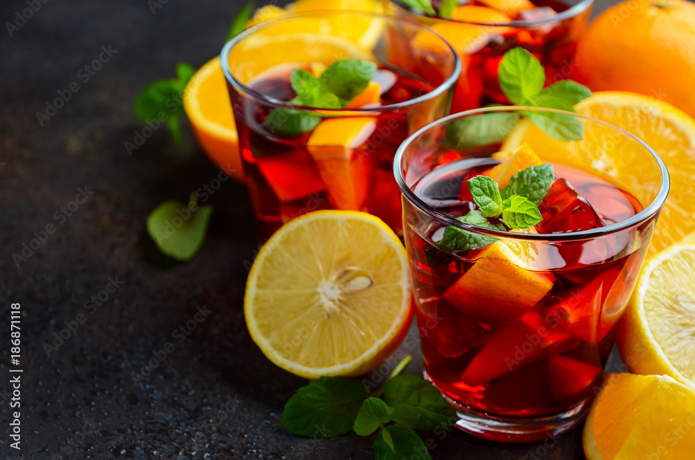 Fototapeta Spanish sangria cocktail and ingredients on dark concrete or stone background, selective focus, copy space
