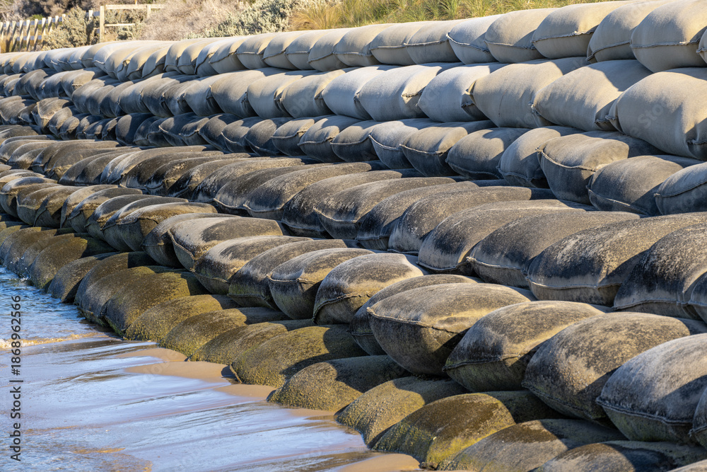 Fototapeta Stacked sandbags installed along the shoreline at Portsea Beach in Victoria, Australia, forming a coastal protection barrier against erosion and wave impact