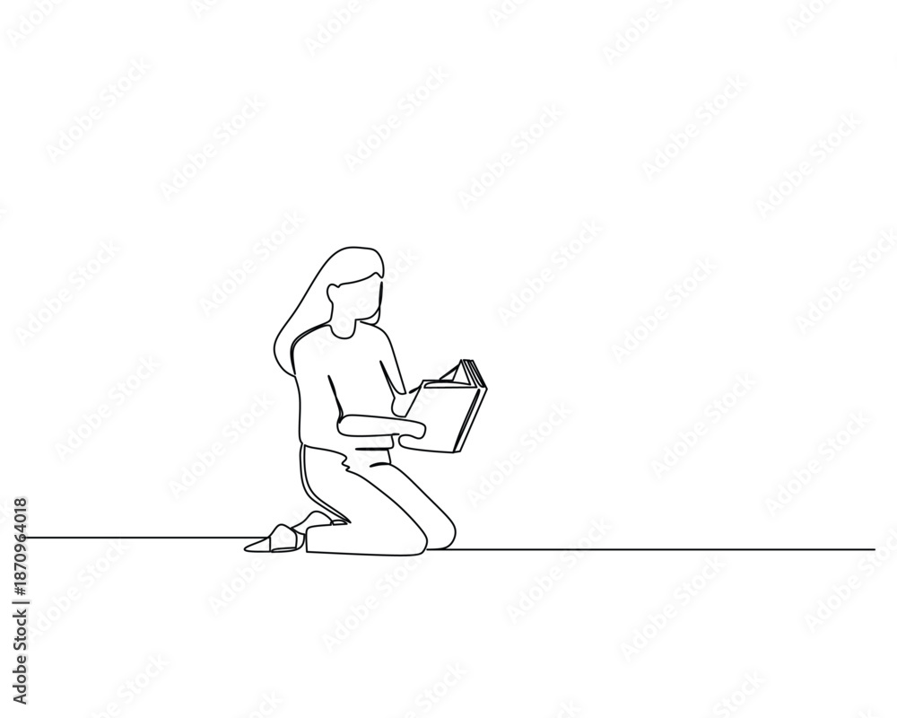 Fototapeta Woman kneeling on the floor reading a book in a minimalist line art style