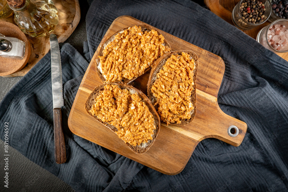 Fototapeta Slices of bread with egg and sprat paste in tomatoes