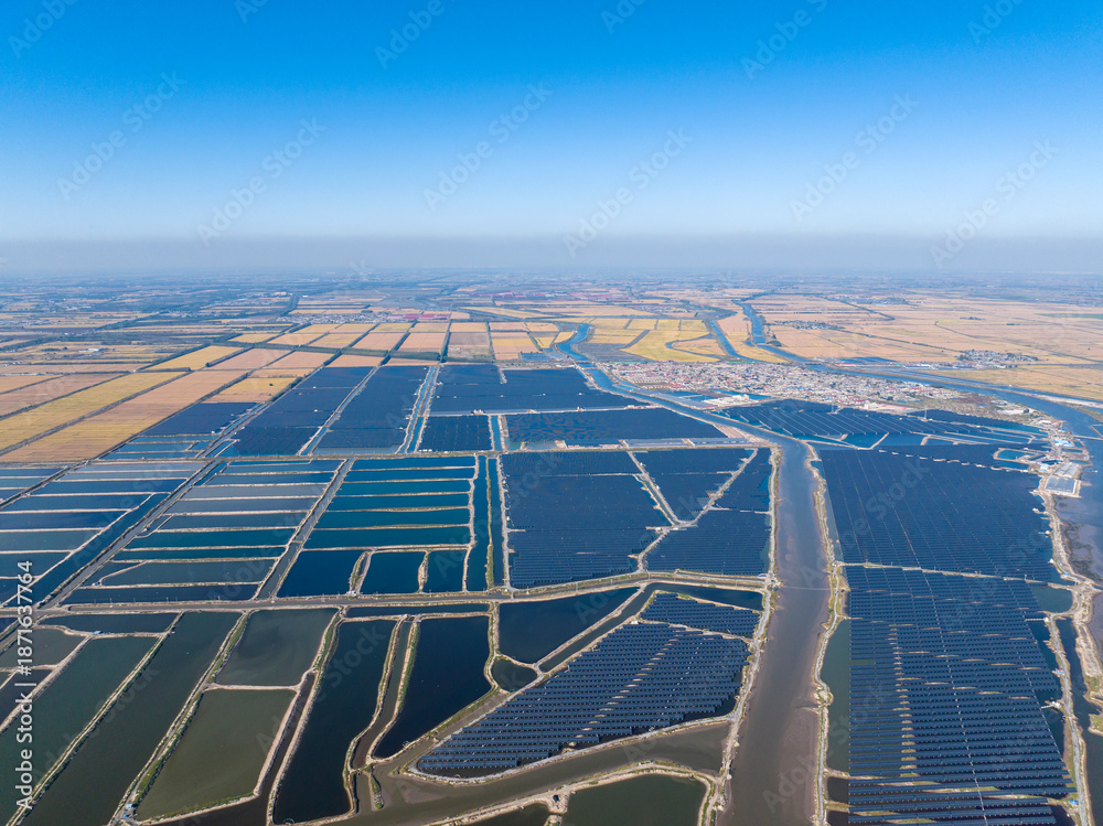 Fototapeta Village, fishpond, solar photovoltaic panels and paddy fields