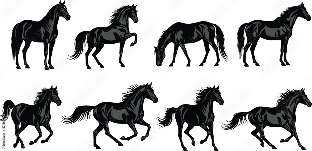 Fototapeta Black horse silhouette collection showing running, walking, standing poses isola