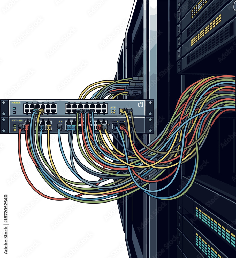 Fototapeta Create a Network switch and network cables in modern server room data center vector art with white background