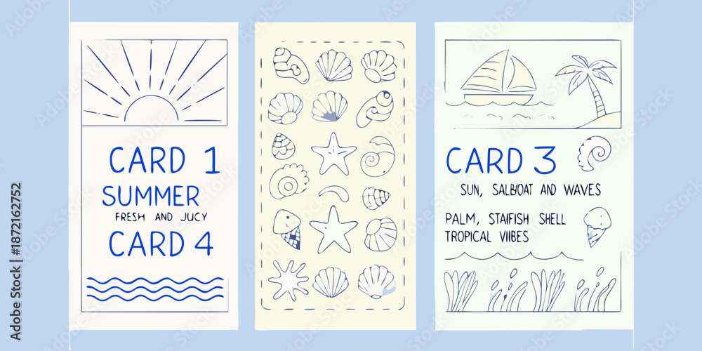 Fototapeta Three illustrated cards depicting summer themes sun shells sailboats and palm tr