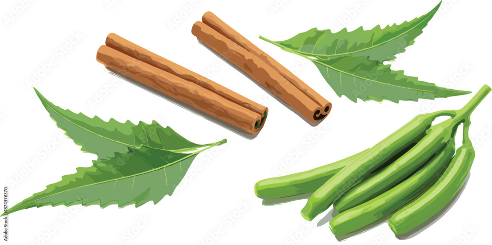 Fototapeta Set of realistic kitchen ingredients featuring cinnamon sticks green chilies and fresh bay leaves isolated on white