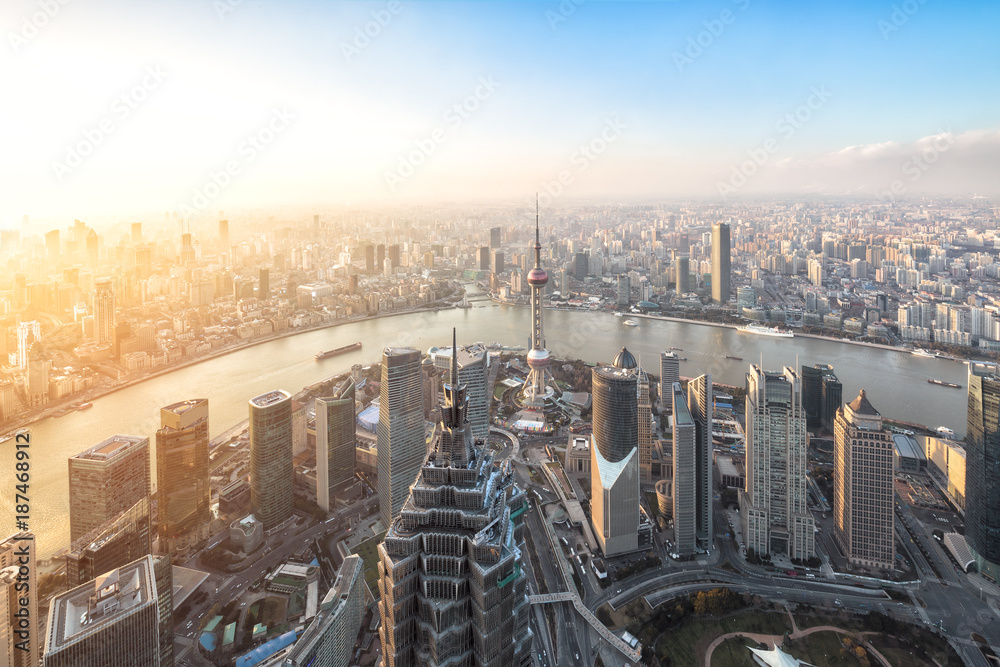 Fototapeta Shanghai skyline and cityscape at sunset