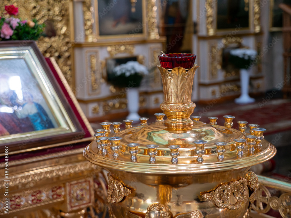Fototapeta Ornate golden liturgical lampada stand with red glass oil lamp inside orthodox c