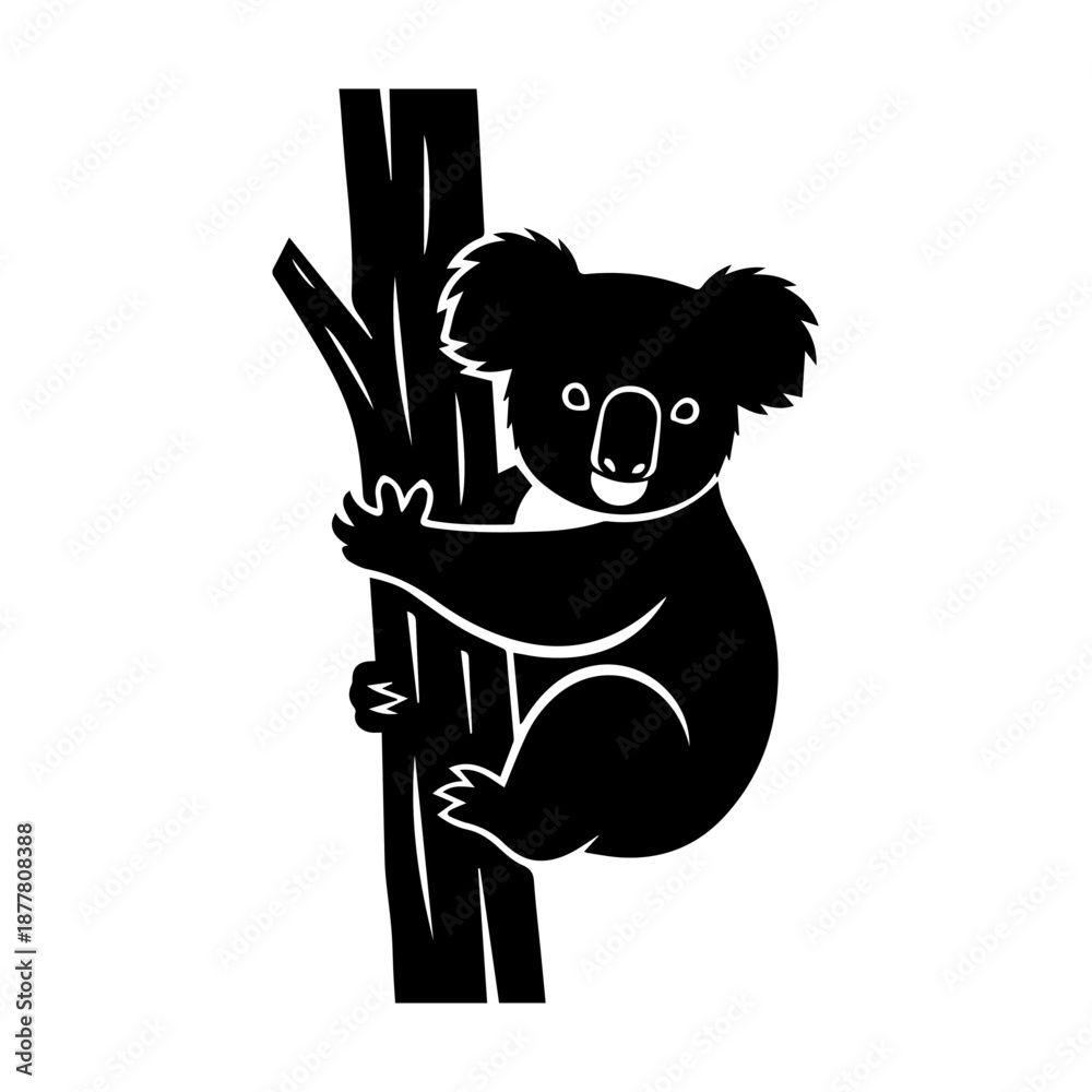 Fototapeta A black silhouette of a cute koala bear clinging to a tree trunk.