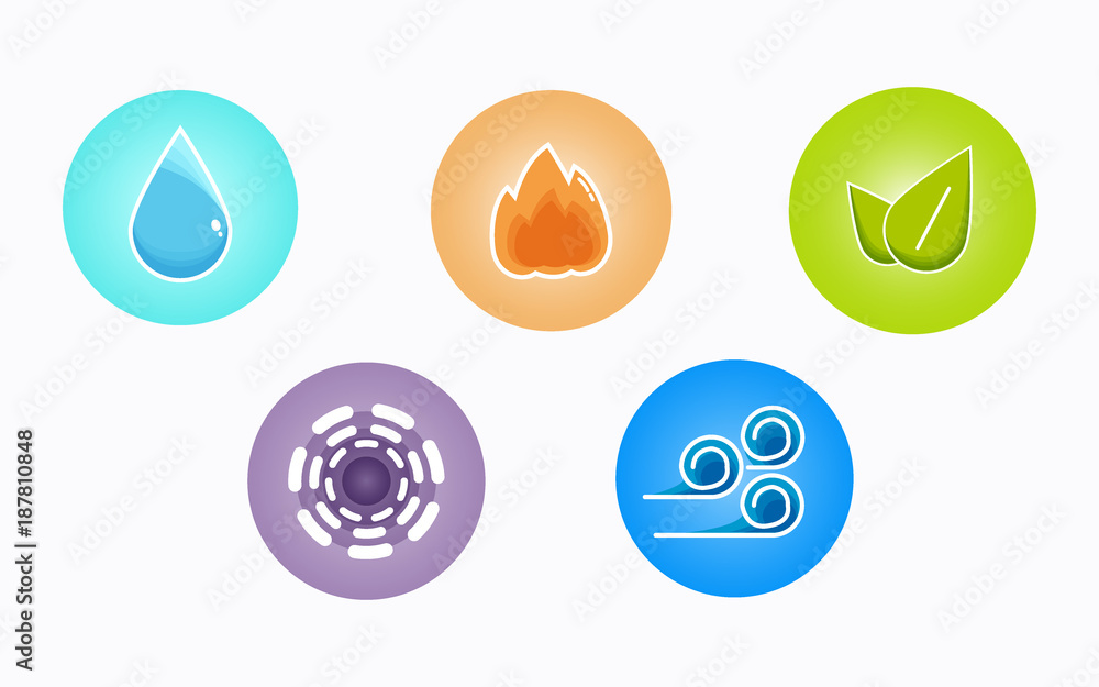 Fototapeta Ayurvedic elements water, fire, air, earth and ether icons isolated on white background