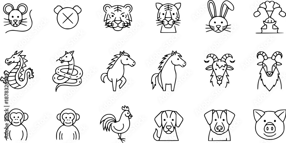 Fototapeta Simple Chinese Zodiac Animals Outline Icons Set