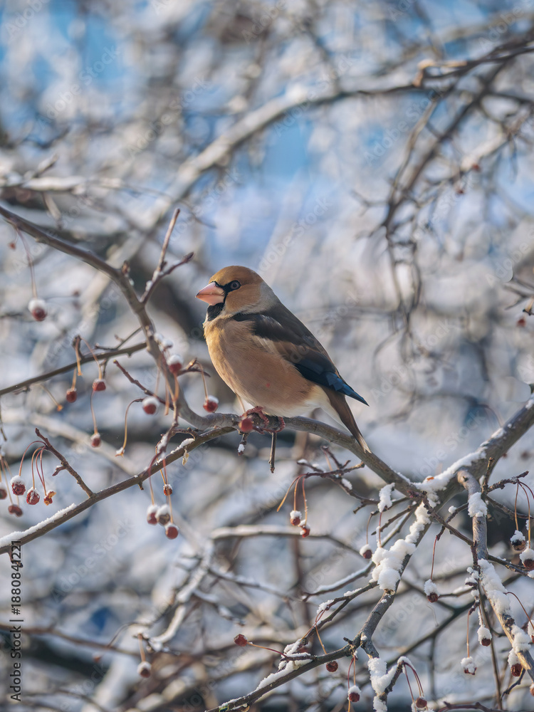 Fototapeta A hawfinch is perching on a branch of a crabapple tree in a winter garden