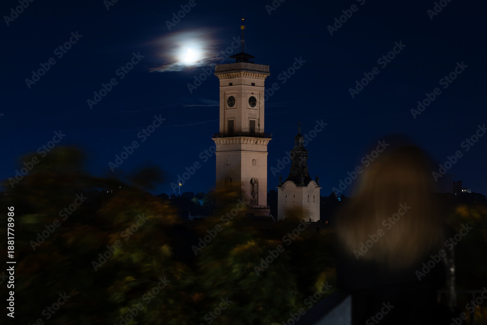 Fototapeta night city scape town hall landmark Eastern Europe long exposure view of Lviv Uk