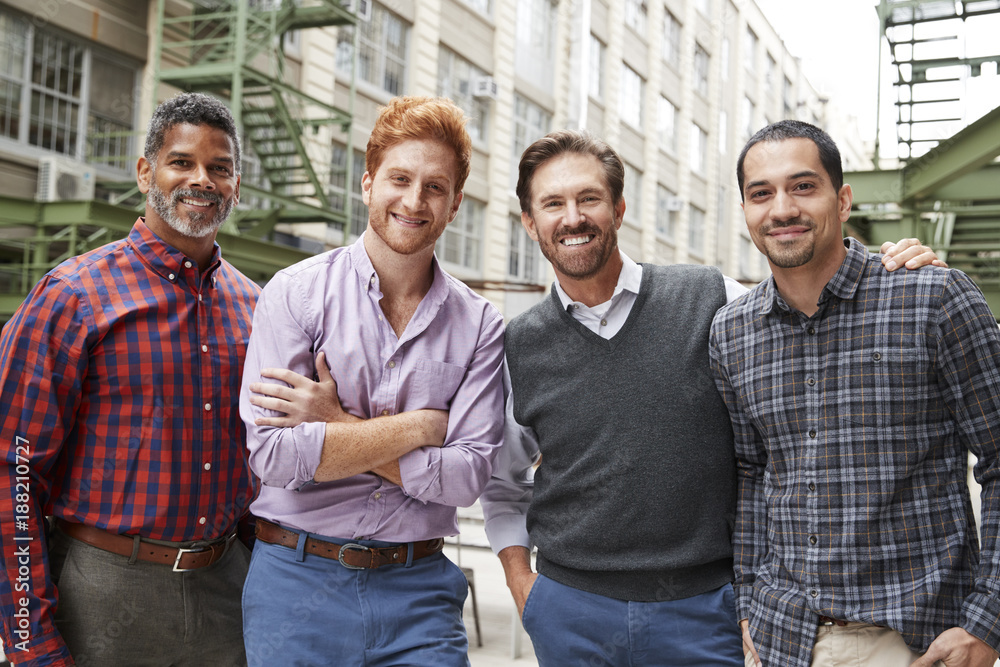 Fototapeta Four male coworkers smiling to camera outside