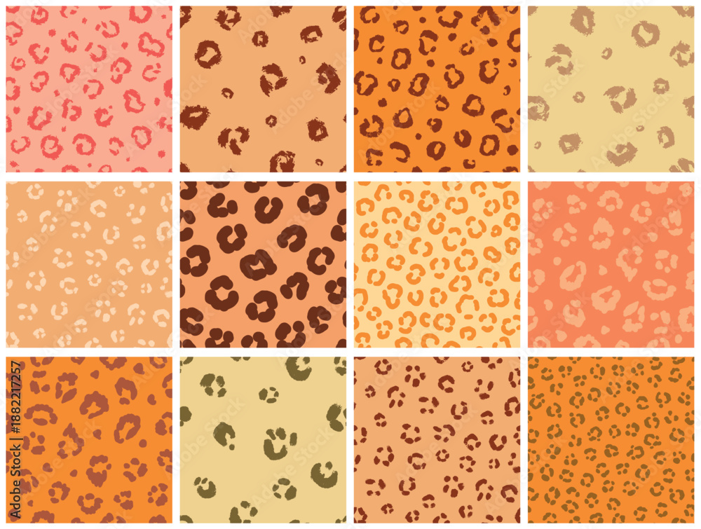 Fototapeta Collection of cute animal skin and fur seamless patterns, mammals, big cats cheetah tiger and jaguar, zebra and cow