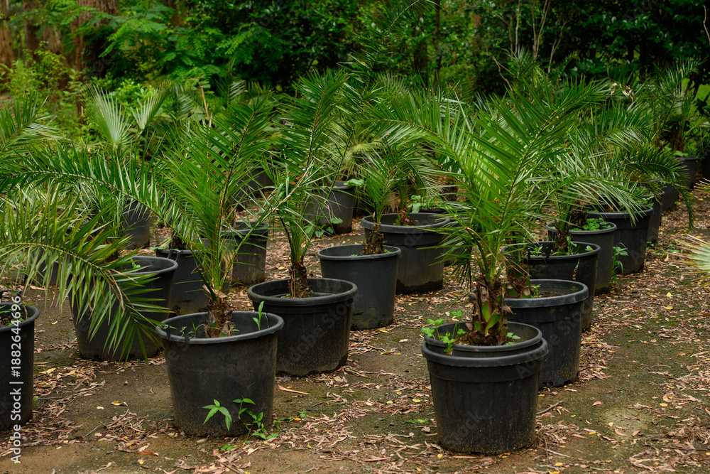 Fototapeta Young palm trees planted in rows in pots; palm seedlings are ready for urban landscaping