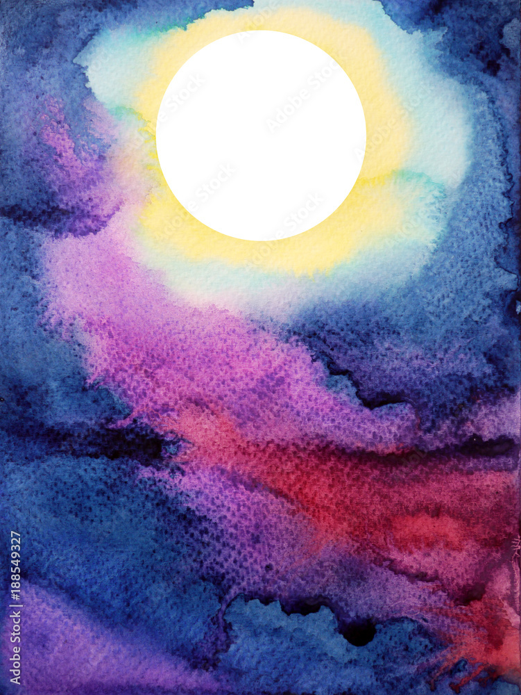 Fototapeta white big full moon on dark blue night sky watercolor painting illustration desi