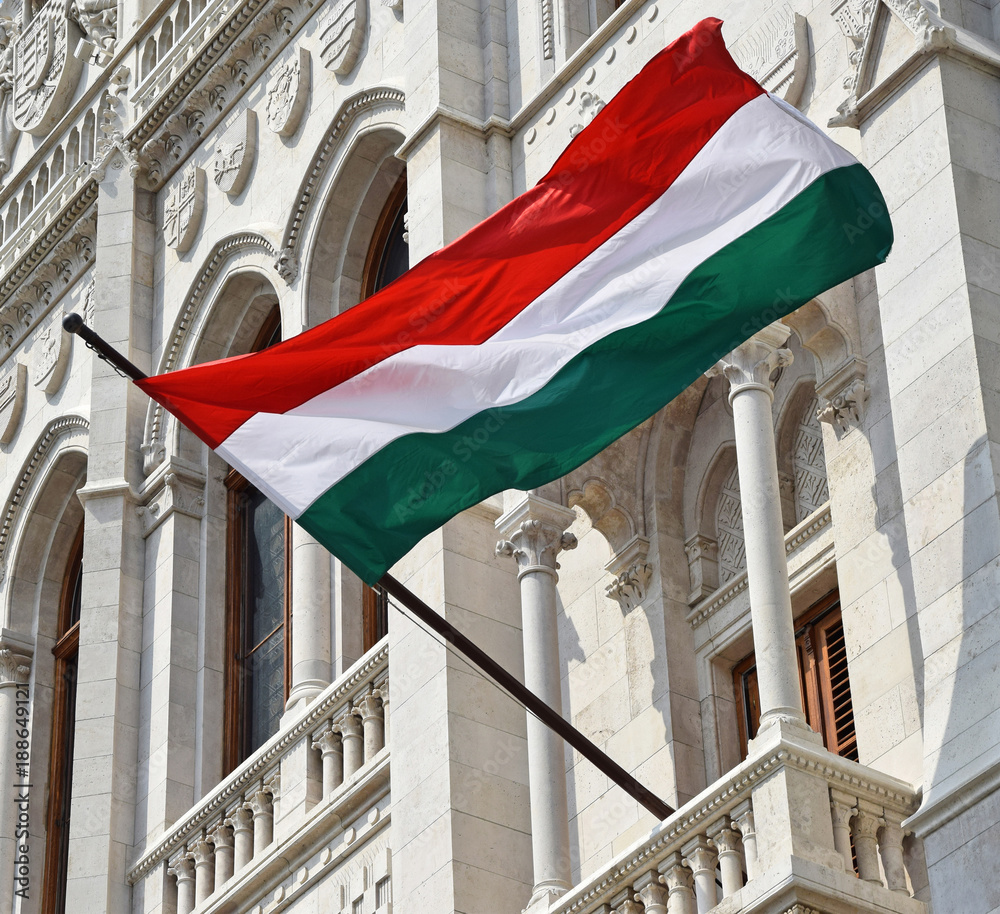 Fototapeta Hungarian flag in the window of the parliament building, Budapest, Hungary
