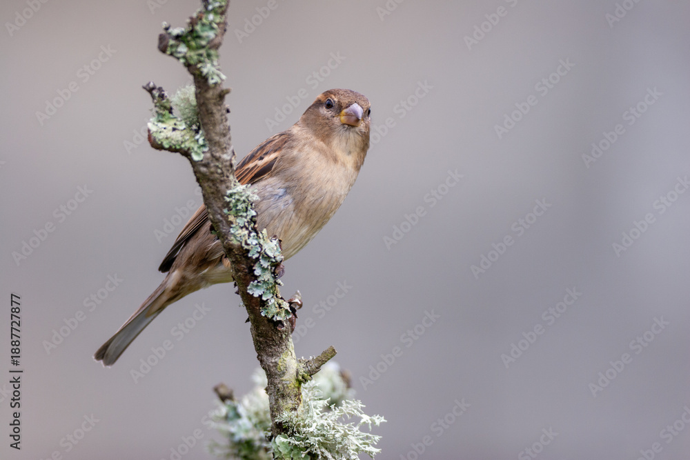 Fototapeta Female House Sparrow (Passer domesticus) perched on a lichen-covered branch
