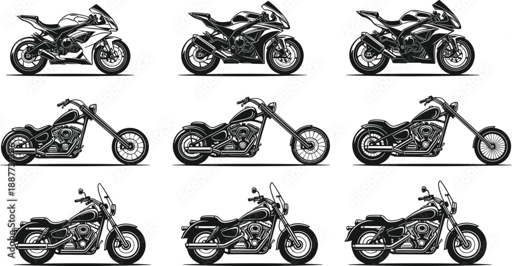 Fototapeta Set of motorcycle silhouettes in sport, chopper, and cruiser styles, detailed bl