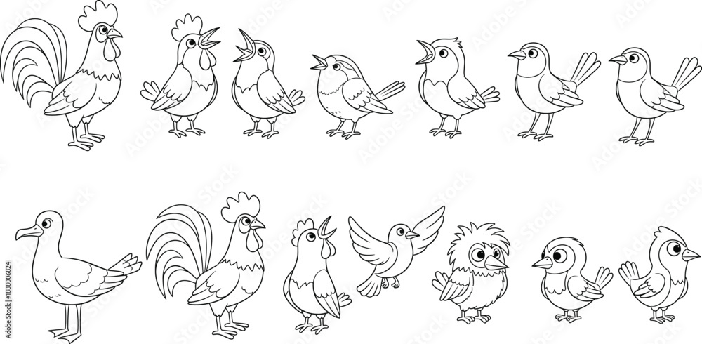 Fototapeta Hand drawn cartoon farm birds set with rooster and chicken characters in black a