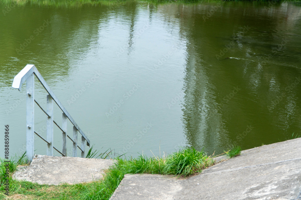 Fototapeta High angle view of weathered concrete stairs with a metal handrail descending into green murky river water from a stone embankment slope featuring sparse grass and ripples on the water surface