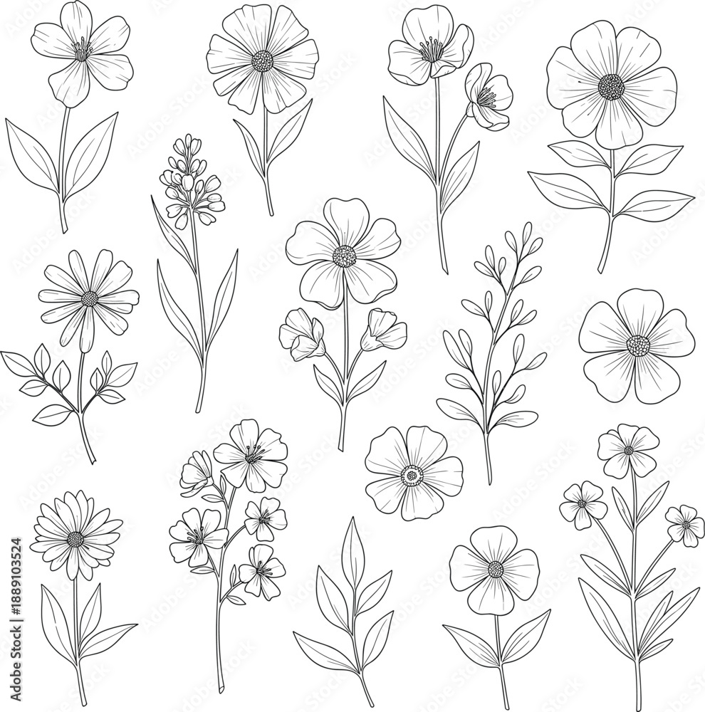 Fototapeta Large collection of hand drawn minimalist botanical elements featuring diverse wildflower blossoms leafy stems and floral sprigs for custom branding