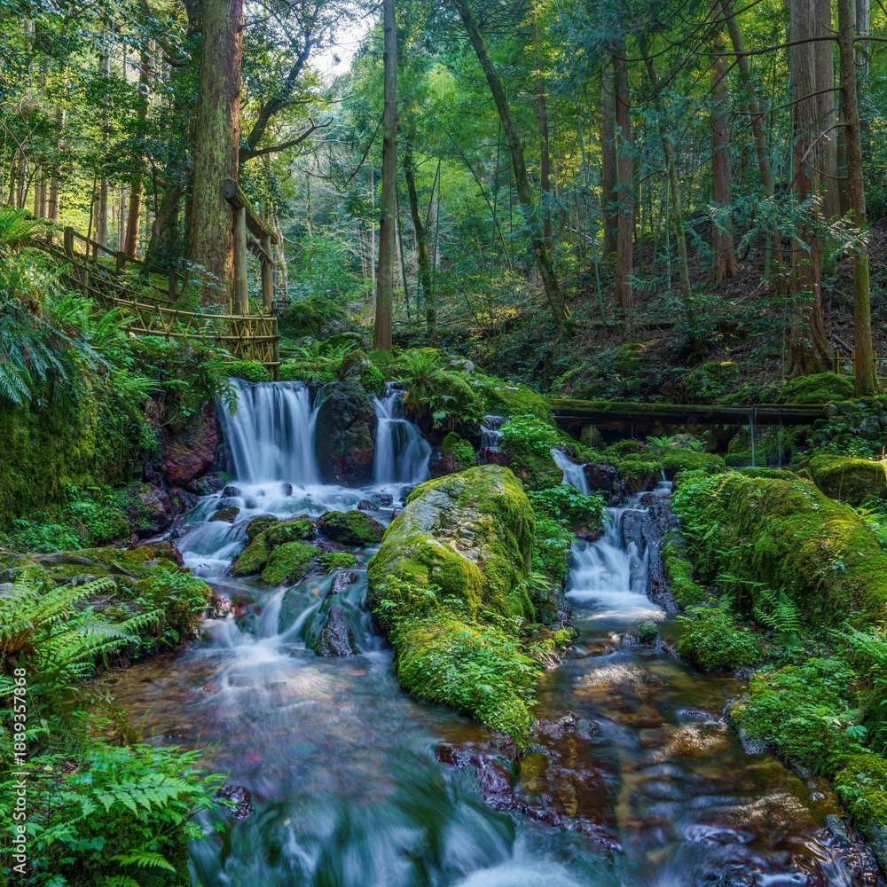 Fototapeta 癒しの森:清流の瓜割の滝と緑豊かな苔の景色、森林浴のイメージ素材