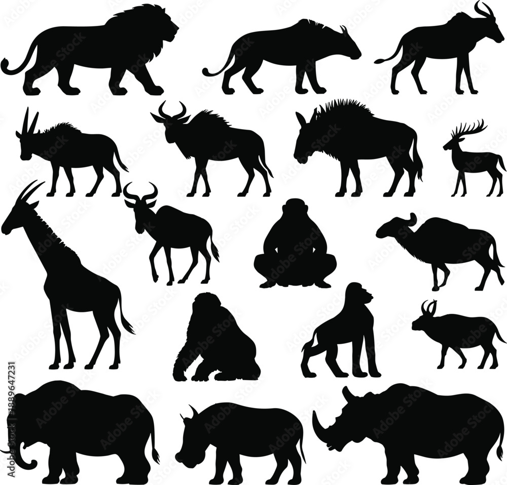 Fototapeta African wildlife silhouette collection featuring lion elephant giraffe rhino ant