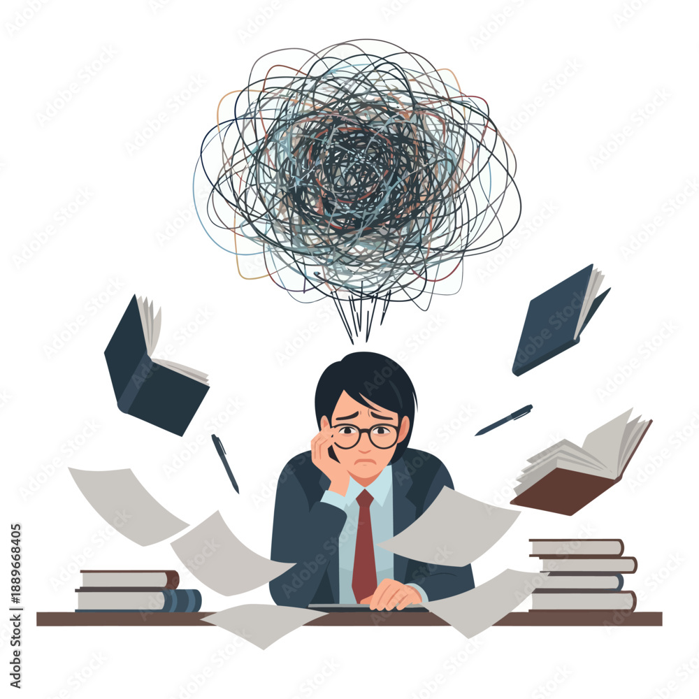 Fototapeta Man Overwhelmed by Papers and Thoughts.