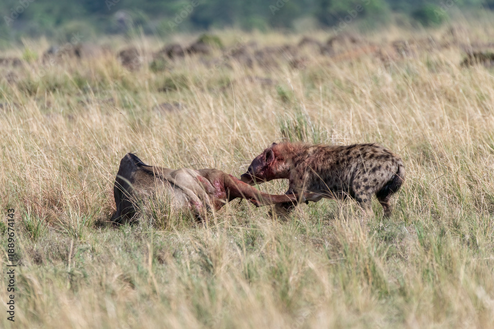 Fototapeta A laughing hyena killing a wildebeest near mara river inside Masai Mara National