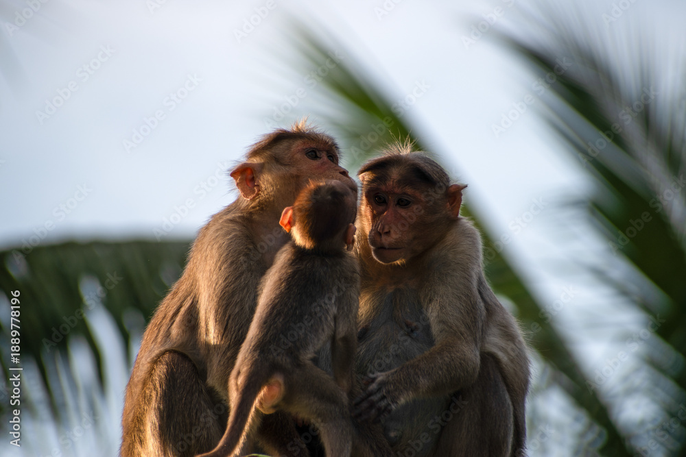 Fototapeta Three Monkeys Sitting Together on Tree Branch in Natural Light.