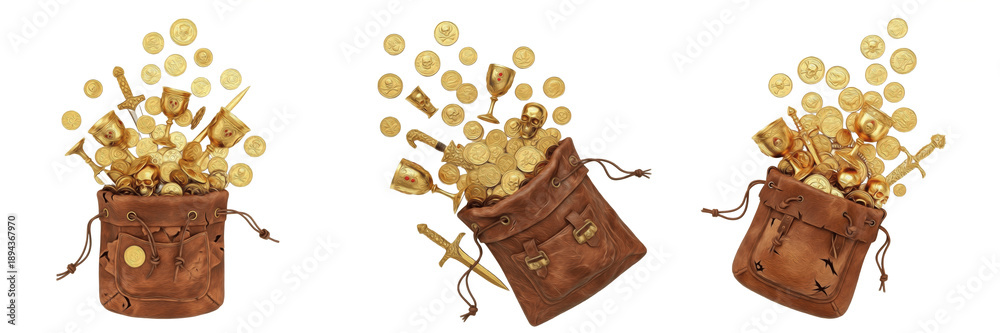 Fototapeta Leather pouches overflowing with gold coins and medieval treasure loot