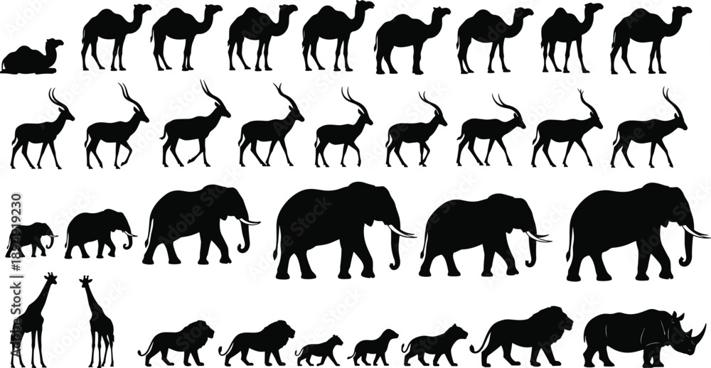 Fototapeta Black Wildlife Silhouette Collection Featuring Camels Gazelles Elephants Giraffe