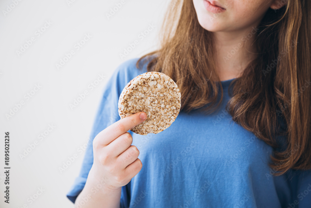 Fototapeta Whole grain cake, buckwheat cake, rice cake in the hands of a girl