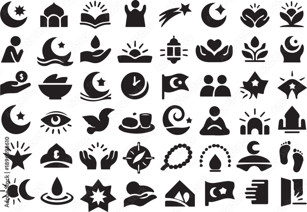 Fototapeta Collection of Muslim culture decorative elements, mosque, crescent moon, and Kaaba icons for design
