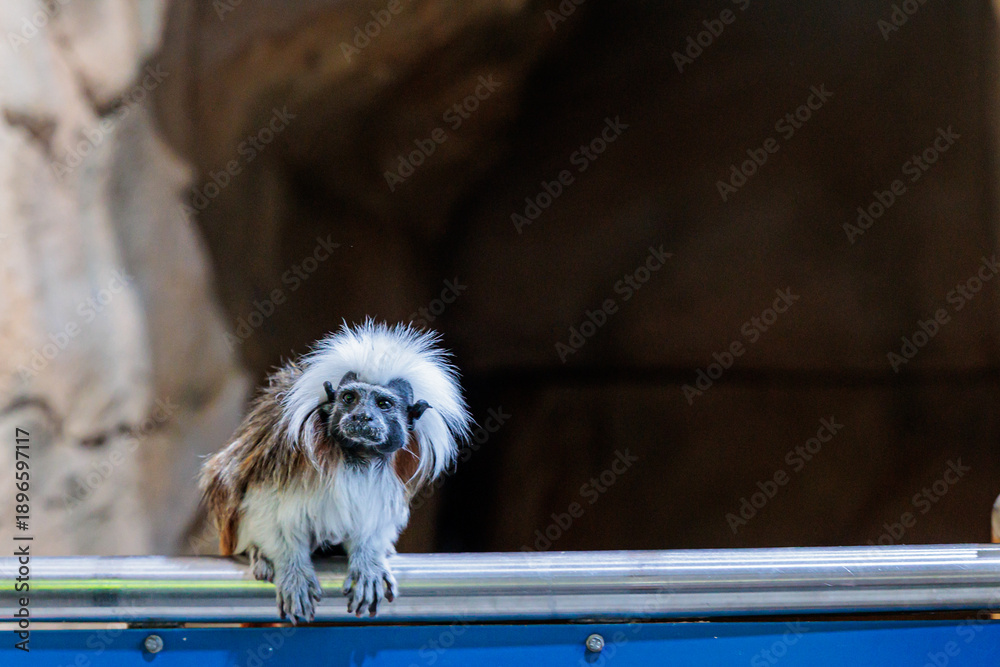 Fototapeta A small tamarin monkey perches atop a blue warning sign with a red stop symbol,