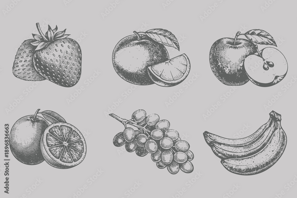Fototapeta Banana, Apple, Orange, Grapes, Mango, Strawberry in vintage engraving style vector illustration