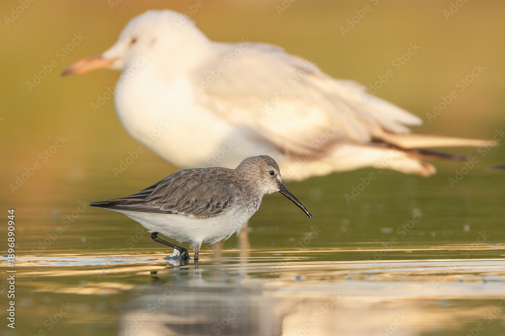Fototapeta Dunlin - Calidris alpina wades in the shallows of Ad Dahariz, Oman, with a Slender-billed Gull - Chroicocephalus genei blurred in the background